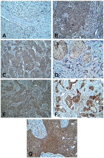 Immunostaining was evaluated using the immunoreactive score (IRS) system [30,31]. IRS gives a range of 0–12 as a product of multiplication between a positive cells proportion score (0–4) and a staining intensity score (0–3). Staining extent was scored as 0 (no positive cells), 1 (<10%), 2 (10%–50%), 3 (51%–80%), and 4 (>80%) according to the percentage of positively stained cells. Staining intensity was scored as 0 (no color reaction), 1 (mild), 2 (moderate), and 3 (intense). Based on final IRS scores, immunostaining was determined to be negative (IRS score 0–1), mild (IRS score 2–3), moderate (IRS score 4–8), and strongly positive (IRS score 9–12) [30,31]. Immunostaining was evaluated by two pathologists (AM and NA) who were blind to patient demographic data, clinical data, and pathological data. The concordance rate was more than 90%. Discrepancies were resolved by joint discussion. Representative examples of staining for each antibody are shown in Figure 1. Positive control slides were included, and negative controls were run with the primary antibody replaced by buffer.