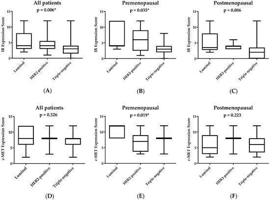Expression of IR and c-MET among breast cancer patients according to molecular subtype and menopausal status. IR, insulin receptor. Boxplots represent median IR scores (A–C) and c-MET scores (D–F). The boxes represent the 25th and 75th percentiles, whereas the bars represent minimum and maximum values. * p < 0.05 between molecular subtypes, according to Kruskal–Wallis analysis of variance.