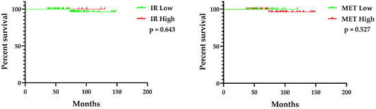 Figure 3 shows the overall survival (OS) of breast cancer patients stratified by the expression status of IR and c-MET. Survival curves for patients with low or high expression of IR were not significantly different (p = 0.643, Log-rank (Mantel–Cox) test). Similarly, the expression status of c-MET did not result in significant differences in patient OS (p = 0.527, Log-rank (Mantel–Cox) test).