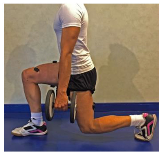 - Lunge. Prior to the start of the exercise, the position of reference (Figure 1) was determined, and the distance between the feet of each player was measured and marked on the ground with adhesive tape. To detect this position, the subject was placed in the reference position in such a way that the knee and hip of the forward leg and the delayed leg were at 90 degrees using the Lafayette Gollehon goniometer (Lafayette Instrument Company, Lafayette, IN, USA). The starting position was leg forward in contact with the ground and knee extended and back leg in contact with the ground and knee extended, with a straight trunk and looking forward. From the starting position, the subject had to bend the knees to lower the body, keeping the trunk straight. Once down, after two seconds the subject started the ascension phase extending both knees until the initial position with both feet in contact with the ground and knees extended. It was ensured that the knee of the advanced leg did not surpass the toe of the foot [7].