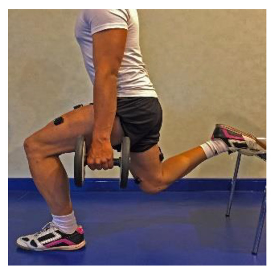 Asymmetry in soccer players could be offset with proper exercise prescription, which facilitates improvements in musculoskeletal function by addressing the specific needs of the subject as an integral part of any rehabilitative, preventive or maintenance program [16]. Functional weight-bearing exercises have received a significant amount of attention as the preferred mode of exercise for lower extremity strengthening [17]. In studies with EMG, basic movements with additional weight (forward lunge, Bulgarian squat, lateral step-ups, squat) are frequently used so that they are easily replicable [18,19], and such exercises do not cause an excessive muscular fatigue in players, permitting their use throughout the preseason and in-season. These are simple exercises used to strengthen the quadriceps and hamstrings, and their study could provide information about the activation of different muscles of the quadriceps and hamstrings and to differentiate the activation differences in the exercise phases (concentric, isometric and eccentric) [20]. Considering the muscle group that they target, these exercises can be crucial for soccer players given that recent research has shown that monitoring the electrical activity of individual muscles could help in the injury rehabilitation and prevention process [20,21].