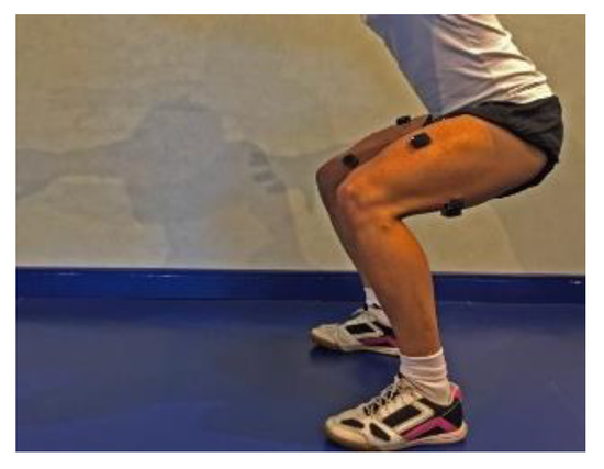 After warming up, sEMG sensors were placed on both thighs, on the rectus femoris (RF), vastus medialis (VM), vastus lateralis (VL), biceps femoris (BF) and semitendinosus (ST) with the players’ skin being shaved and cleaned with alcohol prior to sensor placement. The sensors were always placed by the same person, the physical trainer. The Seniam protocol was used for sensor placement [41], and recommendations of Ramírez and Garzón [42] were followed, with the orientation for the rectus femoris being 0°, 70° for the vastus medialis and −20° for the vastus lateralis, taking as reference a line drawn from the origin and to the insertion.