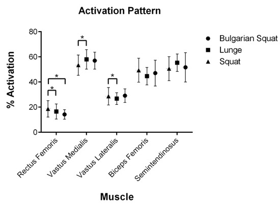 sEMG activation patterns in different muscles differed across the muscle group to which they belonged. Comparing the different phases of the exercises (the Bulgarian squat, the lunge and the squat), in the quadriceps the isometric phase had the greatest activation followed by the concentric and eccentric phases, while in the hamstrings the concentric phase was the one with the greatest activation.