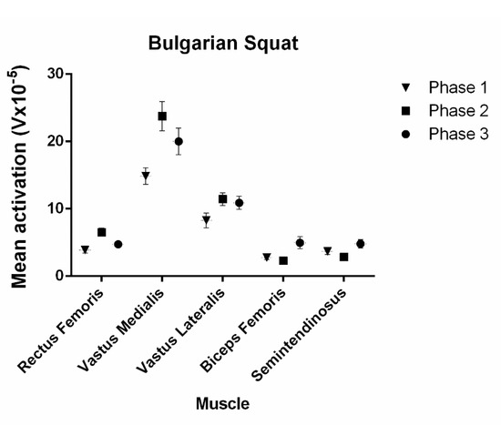 Mean activation (V × 10−5) of all the muscles in each phase in Bulgarian squat. The first phase corresponds to the descent, the second to the isometric phase and the third to the ascent. The vertical lines around the data represent the SD.