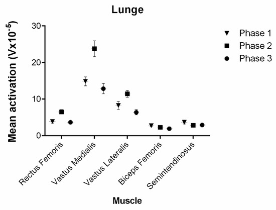 Mean activation (V × 10−5) of all the muscles in each phase in lunge. The first phase corresponds to the descent, the second to the isometric phase and the third to the ascent. The vertical lines around the data represent the SD.