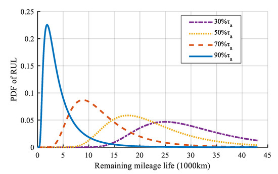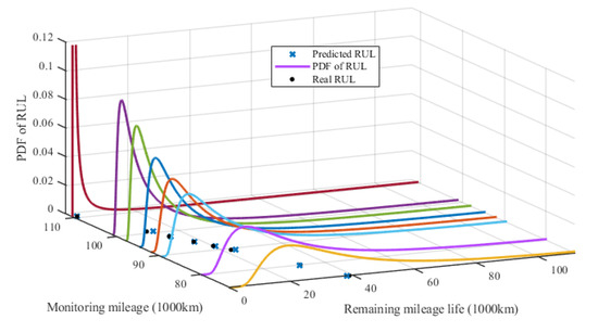 According to the wear data X0:k, the Equations (8), (9) and (11), the PDF of RUL prediction for PCCS is: