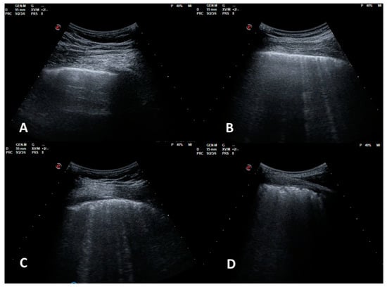 LUS patterns. (A): pattern 1, near normal; (B): pattern 2, SIS with predominance of reverberant artifacts; (C): pattern 3, SIS with vertical predominance and altered pleural line; (D): pattern 4, white lung with altered pleural line.