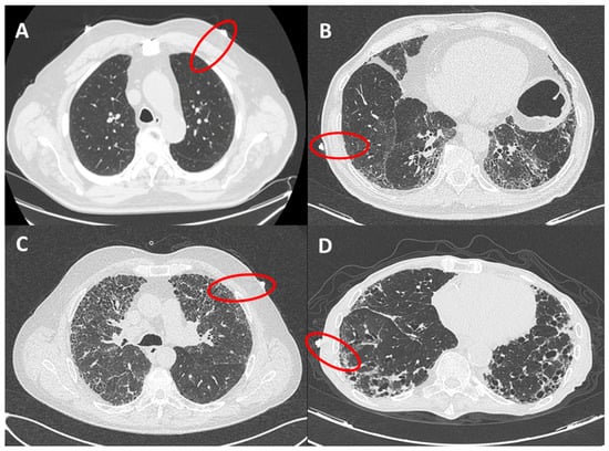 HRCT grades related to red circles showing landmarks of ultrasound assessment. (A): grade 1 (from 0 to 10% of fibrotic changes, mild alterations); (B): grade 2 (10–50%, moderate); (C): grade 3 (50–90% severe); (D): grade 4 (90–100%, massive fibrotic subversion or honeycomb).