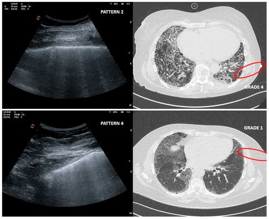 As far as LUS pattern 2 is concerned, agreement with HRCT grade 2 has been reported in 24 out of 30 cases (77%). It is really important to focus on the 4 cases in which a LUS pattern 2 was associated with HRCT grade 4 related to peripheral large honeycomb cysts (massive fibrosis subversion) (Figure 3).