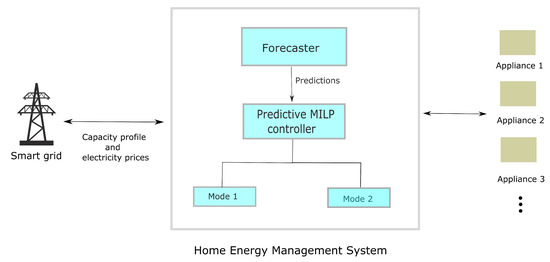 - The second and the key component of the HEMS is the Predictive MILP controller. This component operates in two MOO, which is determined automatically within the component based upon the electrical load categories (see Section 3.1). In each mode, a different mathematical optimization problem is solved by exploiting the predictions made by the forecaster about the weather conditions. The electricity prices and the consumption-capacity profile is provided to HEMS by the smart-grid operator using smart-meter communication.