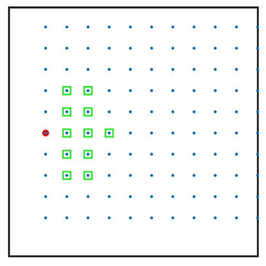 Outline of the support domain used for imposing no-flux boundary conditions. A boundary node is denoted with a red circle, and the corresponding nodes in its support domain with green squares.