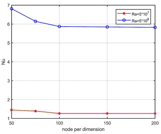 In the present simulations, uniform Cartesian grids with increasing nodal resolution are used, ranging from up to . A grid-independent numerical solution was obtained by a grid of resolution, as seen in Figure 3. The average Nusselt number () on the left vertical wall (hot wall) was computed for validation purposes. The average Nusselt number for the natural convection in the square porous cavity is presented for , and two different values of and . For higher accuracy, a denser grid consisting of nodes was used. The accuracy of the proposed scheme was tested against verified numerical results obtained for MHD natural convection in a square cavity [] (Table 2).