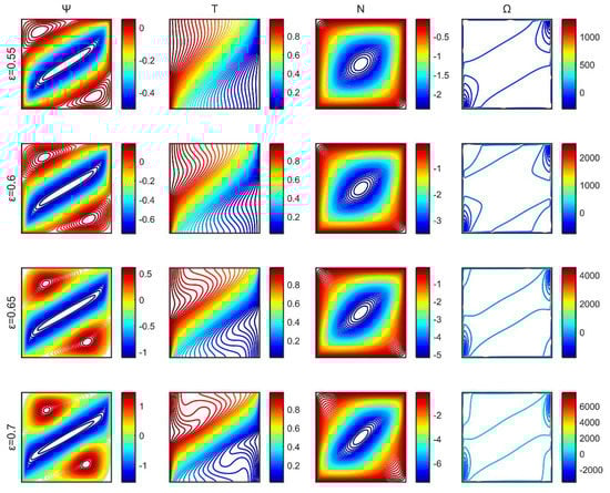 Stream function (), temperature ( ), microrotation ( ), and vorticity ( ) contours for a range of porosities of the medium.