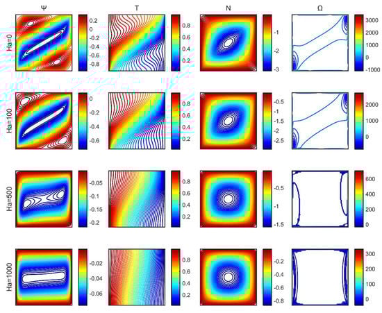 Stream function (), temperature ( ), microrotation ( ), and vorticity ( ) contours for a range of Hartmann numbers.