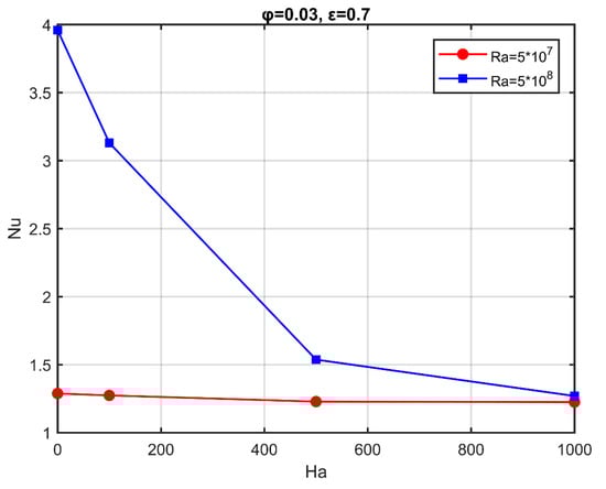 Average Nusselt number as a function of the volume fraction of nanoparticles, for characteristic Hartmann and Rayleigh numbers, and .