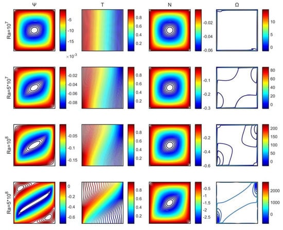 For the low Rayleigh values considered, a large clockwise rotating vortex was formed, as shown in Figure 8. The fluid rose from the left vertical wall, the location of the heat source, and flowed downward along the right vertical wall. By increasing the Rayleigh number, isotherms expanded gradually, as they emerged from the heat source and reached the rest of the walls. Furthermore, the flow regime became stronger, and the streamlines were intensified. For higher values of the Rayleigh number (), the two anticlockwise rotating formations appeared in the stream function contour, and the distribution of the isothermal lines changed from conduction-controlled to convection-dominated. For small values of the Rayleigh number, a minute variation on the vorticity was observed near the walls of the cavity. Microrotation contours had a central vortex at the middle of the cavity that elongated diagonally for elevated values of the Rayleigh number.