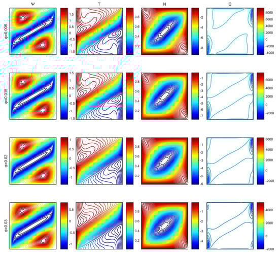 Stream function (), temperature ( ), microrotation ( ), and vorticity ( ) contour plots for characteristic volume fractions of the nanoparticles.