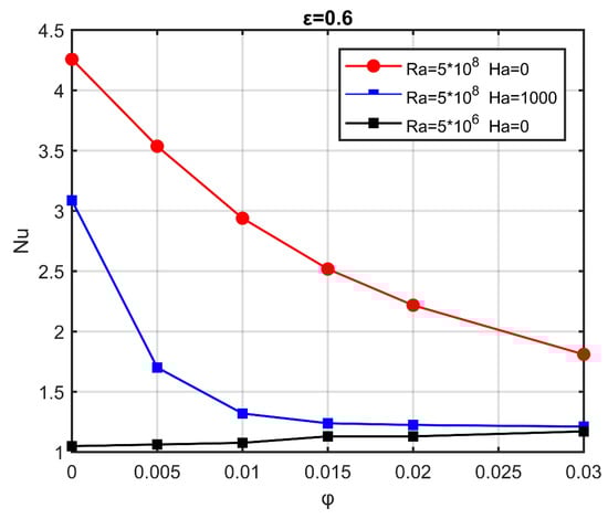 The dependence of Nuave on the solid volume fraction is shown in Figure 11. At low-flow conditions, , conduction is the dominant mechanism for heat transfer, and the Nusselt number increases as the volume fraction of the particles increases, as expected by the increased thermal conductivity offered by the nanoparticles with respect to the base fluid thermal properties. As the flow conditions intensify, convection is at play, and increases, as well, provided the volumetric concentration of nanoparticles is constant. However, at elevated flow conditions, , even in the absence of a magnetic field, the Nusselt number is reduced as the volume fraction of the nanoparticles increases, and this slope declines as the Rayleigh number increases. As the Hartmann number increases, the Nusselt number recedes further.