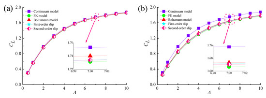 The influence of aspect ratio and Knudsen number on load capacity and friction coefficient of Boltzmann model are shown in Figure 7 and Figure 8 for ε = 0.6 and Λ = 5. As the value of aspect ratio increases, it is noted that both the load capacity and friction coefficient increase. The CL firstly increases and then subsequently asymptote to a constant value for a small Knudsen number regime. When the Knudsen number is further increased, the load capacity and friction coefficient are nearly proportional to the aspect ratio, and it causes a slight change in dimensionless load capacity at nanometer scale. This is because the lower clearance may weaken the shear stress of the rarefied gas flow and the extent of the flow in the sliding direction is quickly decreased.