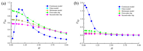 Figure 9 and Figure 10 present the variations of the dynamic stiffness and damping coefficients of different correction models with perturbation frequency for ε = 0.5, B/D = 0.8 and Λ = 3 when Kn = 0.65. It is seen that the perturbation frequency has great influence on the dynamic coefficients. As the perturbation frequency increases, the dynamic stiffness and damping coefficients Kxx, Kxy, Kyy and Dyx increase. The increasing extent of Kyy is bigger than Kxx because of the gas film mainly supports the weight of high-speed rotor along the vertical direction, while Kyx, Dxx, Dxy and Dyy decrease quickly. With gas rarefaction effects taken into account, the direct stiffness coefficients Kxx and Kyy are linearly proportional to the perturbation frequency, but the direct terms of the damping coefficients Dxx and Dyy decrease slightly with the rise of frequency. Meanwhile, the cross coupled stiffness coefficients Kxy and Kyx gradually approach to the constant values with increasing Ω, yet the Dxy and Dyx are hardly affected by perturbation frequency. The dynamic stiffness coefficients for rarefaction models are less than those of continuum flow. When Ω > 2.0, the direct damping coefficients with the effects of gas rarefaction are higher than those of continuum flow. The reason might be that the energy transport by gas molecule collision is less, to some extent, which gives a larger value of fluid film stiffness and a larger gas film damping coefficient. The first-order slip model overestimates the stiffness coefficients of micro gas journal bearing compared with the simulation results of Boltzmann model, while the second-order velocity slip model underestimates it. Because the FK model is obtained based on the linearized Boltzmann equation, its results are in good agreement with those of the Boltzmann model.