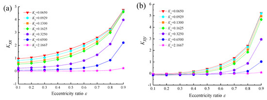 To investigate the effect of eccentricity ratio on dynamical coefficients of Boltzmann model for Ω = 2, Λ = 3 and B/D = 0.5, comparisons of stiffness and damping coefficients at different values of Knudsen number from Kn = 0.065 to Kn = 2.1667 are shown in Figure 11 and Figure 12. It can be observed that the dynamic stiffness coefficients rise markedly with increasing eccentricity ratio. The reason is that the larger eccentricity ratio ε yields the smaller gas film thickness H of gas-lubricated microbearings, which leads to the increase in the Poiseuille flow rate. For small Knudsen number flows Kn < 0.325, the damping coefficients Dxy, Dyx and Dyy decrease while Dxx remains nearly constant as the eccentricity ratio increases. The increase in Knudsen number, which indicates that the rarefaction effect tends to be stronger. With the exception of Dyx, the dynamic coefficients gradually increase when Kn > 0.325. So the increase of direct damping coefficients result in a more stable state of the microbearing system.