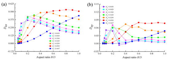Damping coefficients of Boltzmann model against the aspect ratio B/D for various Knudsen numbers. (a) Kxx vs. B/D; (b) Kxy vs. B/D; (c) Kyx vs. B/D; (d) Kyy vs. B/D.