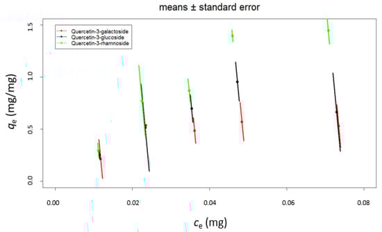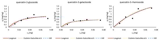 Quercetin adsorption was further studied with more initial quercetin derivative concentrations in order to collect the data to analyze with the adsorption isotherm equations. The results of the adsorption of quercetin derivatives with different initial concentrations are shown in Figure 1. The amount of adsorbed quercetin derivatives increases with increased initial concentration, as shown in previous studies [7,10,16]. Furthermore, it can still be seen that quercetin derivatives have very similar adsorption onto β-glucan. At higher concentrations, quercetin-3-rhamnoside adsorbed in somewhat higher concentrations than quercetin-3-glucoside and quercetin-3-galactoside.