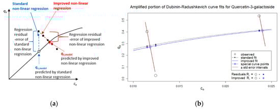 (a) Theory of non-linear regression of adsorption data with standard non-linear regression and novel improved non-linear regression. (b) amplified figure of example of novel improved non-linear regression of Dubinin-Radushkevich isotherms (quercetin-3-galactoside adsorption onto β-glucan).