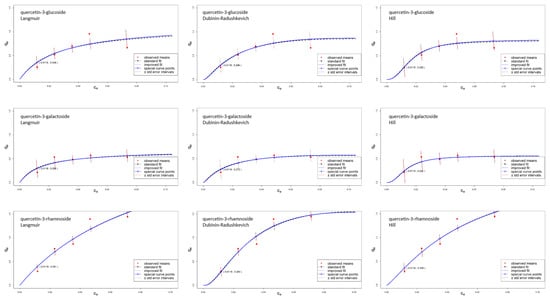 The parameters from the two-parameter Langmuir isotherm determined by the regression are qm and KL. Dubinin Radushkevich is a three-parameter isotherm and the parameters that could be determined are qs, β, and cs. The cs represents the theoretical saturation capacity, so it should be large than the largest observed ce. A convenient constraint value for these data is that it not be smaller than 0.1 mg. With this constraint the non-linear least squares solutions occurred at this value. An equivalent result is obtained by fixing the cs value at the level of 0.1 mg. A least squares value of cs near 0.1 mg occurred automatically for the quercetine-3-rhamoside data, so no constraint was found to be needed in that case. Along with the cs value, we determined qs and β. From β, the energy E was calculated. Altogether, the reported parameters of the Dubinin-Radushkevich isotherm are cs, qs and E. The parameters for the three-parameter Hills model are qm, nH and KD. An approximate least squares values of the Hills constant KD was found at the level 0.0001 for quercetin-3-galactoside and quercetin-3-glucoside (smaller KD values that show potential insignificant improvement were numerically unstable, so we chose the indicated level). The stable least squares value of KD was 0.033 for quercetin-3-rhamnoside. Along with KD, we determined and reported the two additional Hill parameters qm and nH.
