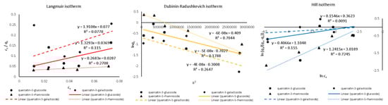 Langmuir, Dubinin-Radushkevich and Hill isotherms of quercetin derivatives adsorption onto β-glucan obtained with linear regression.