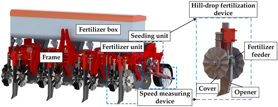 The corn hill-drop fertilizer planter was mainly composed of the fertilizer unit, seeding unit, land wheel transmission system, frame, and speed measuring device. As shown in Figure 1, this is the overall structure of the planter. The hill-drop fertilizer device was a key component of the fertilizer unit, and also an important part of the simulation model in this paper. It is mainly composed of an opener, an intermittent fertilizer feeder, and two covers.