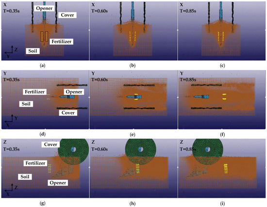 When the working speed was set to 1 m/s, the depth of soil of the opener was 250 mm, and the depth of soil of the cover was 100 mm. The start time was set when the opener touched the soil, and the simulation ended when it left the soil completely. The fertilizer movement in the three directions of X, Y, and Z is shown in Figure 2. Figure 2a,d,g shows state diagrams when the time was 0.35 s. The hill-drop fertilizer device started to contact the fertilizer. Figure 2b,e,h shows state diagrams when the time was 0.60 s. The soil was damaged by shearing and squeezing from the opener and cover, which caused large disturbance. The fertilizer was displaced by gravity and the surrounding soil. Figure 2c,f,i shows state diagrams when the time was 0.85 s. With the increase of time, the contact between the opener and soil increased, and the disturbance range of the fertilizer and soil became larger, and the deformation degree of the fertilizer increased.