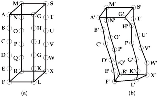 In order to visualize the overall displacement and deformation of the fertilizer, 24 points on the four vertical edges of the fertilizer cube were taken for tracking analysis. The height of the fertilizer cube in the vertical direction was 100 mm, and the length in the forward direction was 40 mm before covering with soil. As shown in Figure 3, a schematic diagram of the overall fertilizer deformation based on the simulation results was drawn. In Figure 3a, the fertilizer state is shown before covering with soil. In Figure 3b, the fertilizer state is shown after covering with soil. In Figure 3, is the planter’s forward direction, is the vertical direction, and is perpendicular to the planter’s forward direction.