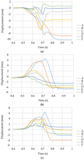 Through LS-PREPOST’s tracking function of particles, 12 points of two vertical edges (AF and MR) of the fertilizer cube were tracked and shown to study the movement and displacement of fertilizer results. Figure 4 shows the movement process of fertilizer in the three directions of X, Y, and Z from the top to the bottom (A–F) on the right side of the opener. Because the simulation results on the left and right sides of the opener are similar, Figure 5 only shows the results of fertilizer displacement from the top to the bottom (M–R) on the left side of the opener.
