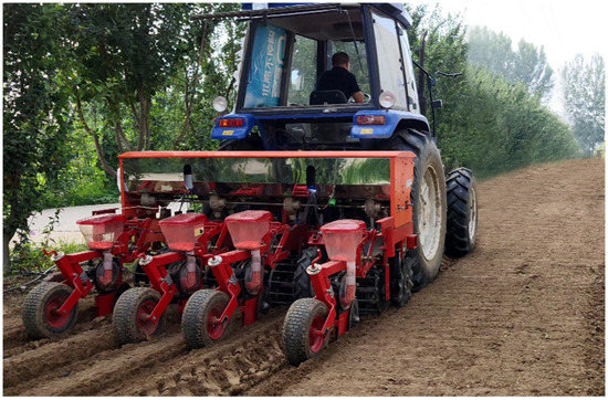 The experiment was conducted in Zhongnong Futong Horticulture Co., Ltd. in Tongzhou District, Beijing in July 2019. Figure 6 shows the situation of the field experiment. The planter was powered by a Foton Lovol M1004-D1 tractor. The fertilizer used was Stanley slow-release fertilizer. The selected corn seed was Zheng Dan 958.