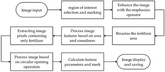 The collected images were processed with HALCON 12.0 software. The extraction algorithm flow of the fertilizer is shown in Figure 7. The image of the circular area was selected where the soil sampler was located, and the area, diameter, and center coordinate of the specific circular area were calculated. In order to reduce interference, the area where the fertilizer was concentratedly distributed was artificially selected. The RGB image of the selected region was converted into a grayscale image. The image enhancement processing was performed to improve the contrast of the image. The threshold was determined by the gray histogram. The region was segmented and binarized. Based on morphological features such as area and roundness, the region of the fertilizer was further segmented. In order to reduce noise, the image was processed in a circular open operation. The area, centroid coordinate, etc. of the treated fertilizer area were obtained and displayed. The center of the soil sampler is marked as a red dot in Figure 8, and the mass center of the fertilizer is marked as a green dot. It is displayed in the variable window.