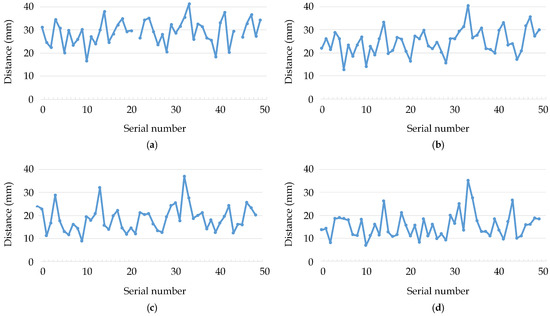 The minimum difference of the measurement results of the fertilizer distribution distance was 20 mm, because the field experiment used 20 mm as a layer to detect the fertilizer distribution. The distance between the upper and lower fertilizer openings of the opener was 100 mm, and the theoretical distribution distance of fertilizer in the vertical direction should be about 100 mm. As shown in Figure 10, it could be seen from the distribution distance of the fertilizer that the distribution distance in the soil was concentrated at 60 to 80 mm. When the distribution distance was 40 mm, it indicated that the accumulation of fertilizer was very serious, but it occupied less. The actual distribution distance of the fertilizer was lower than the theoretical distance, which was mainly because the backflow speed of the soil to the fertilizer ditch is lower than the falling speed of the fertilizer.