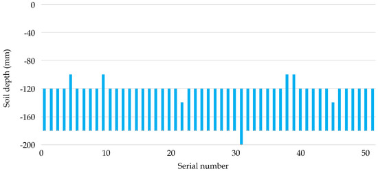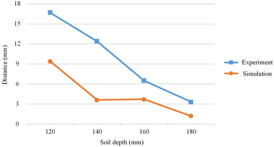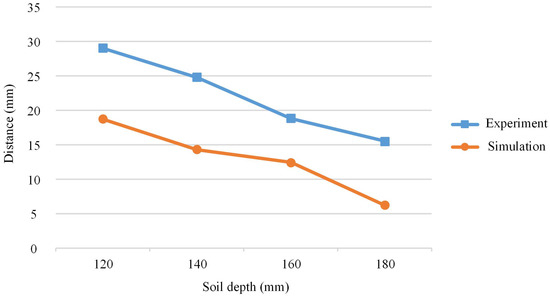 The offset distance of fertilizer in each layer is shown in Figure 9. When the soil depth was 120, 140 mm, 160 and 180 mm, the average displacement of fertilizer was 29, 24.8, 18.8, and 15.5 mm, respectively. The results show that the offset distance of fertilizer decreased as the soil depth increased. The standard deviation of the offset distance of fertilizer at different soil depths was calculated. The results show that the dispersion degree of the offset distance of fertilizer was smaller as the soil depth increased. When the soil depth was 120 mm, there were two breaks in the broken line in the figure. The main reason was that there was no fertilizer at 120 mm due to the vibration of the planter and the uneven terrain, etc. The reason for the large offset distance and dispersion degree of the upper layer was analyzed. The main reason was that the designed cover restricted the soil displaced by the opener from moving to both sides and the soil gathered between the two covers. The disturbance degree of the upper layer of fertilizer was increased due to soil backflow.