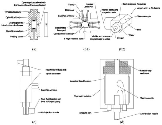Franck et al. [15,67] from Karlsruhe Institute of Technology (KIT) observed laminar reverse diffusion flames in a semi-batch reactor for the first time (Figure 2a). The apparatus they used, mainly made by cylindrical nickel-based superalloy with 80 mm o.d. and 30 mm i.d., was a reaction cell of about 30 mL sample volume, which could hold a sample pressure of up to 200 MPa at 500 °C and above for hours. Two openings at the opposite ends were equipped with sapphire windows of 15mm diameter and 10mm thickness, to directly observe the hydrothermal flame. In addition, there were another four openings, one for the burner, one for a sheathed chromel-alumel thermocouple, and two for the stainless steel capillaries to extract samples and connect the reaction cell with the feed autoclaves, respectively. During the feeding, the bellows were compressed slowly and steadily by special gears, high-torque electric motors and electronic controls. In the meantime, the equivalent number of products was driven out of the cell and entered the gap between bellows and autoclaves, thus forming a circular motion with stable pressure. This reactor was designed to prove the existence of hydrothermal flame. Though product analysis could be carried out by sampling, it was hard to quantitatively understand the laminar reverse diffusion flame with only one thermocouple. Compared with Franck, Sandia National Laboratory designed a semi-batch reactor with its visualization window, measurement methods, feeding mode and safety improved (Figure 2b) [48,68]. To clarify the generation progress of diffusion hydrothermal flame and obtain information on its composition and temperature, three sapphire windows were installed to realize optical diagnostics, recording visible emission with a video camera and shadowgraph images on the videotape, and acquiring composition values and HFR temperatures from spontaneous Raman spectroscopic measurements. During the experiment, reactants including water, fuel and oxidizer were injected through high-pressure liquid chromatography (HPLC). Besides a cylinder fitted with a floating piston that was indispensable in dealing with gas-phase oxidizer, the materials and connections of pipeline system were also designed to minimize potential risks. In addition, the reactor and all the oxygen pipelines were enclosed by secondary shields. Owing to the introduction of in-situ online diagnostic apparatuses, one giant leap has been taken in better understanding the hydrothermal flame.