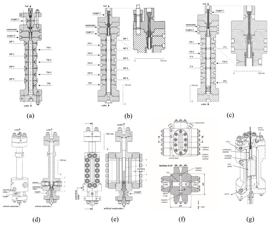 The amelioration for WCHB was thorough and comprehensive. The first generation of WHCB (WCHB-1) was used to prove the possibility of SCWO with continuous hydrothermal flame (Figure 3d) [27]. After the injection of artificial wastewater from the feed tube and the ensuing mixing with oxygen, a high-temperature mixture was formed. Cold water in the outer annulus protected the wall from high-temperature damage. During the reaction, the tip of the hydrothermal flame could be observed through a sapphire window. The second generation WCHB (WCHB-2) was developed on the basis of WCHB-1 (Figure 3e) [27]. The whole flame length, even the part within the stabilization zone near the tip of the core tube, was thus optically accessible. It adopted a new burner, to improve the blockage and other problems caused by treating actual wastewater containing solid particles. Then the third generation (WCHB-3) made it possible to deeply understand hydrothermal flame (Figure 3f) [27]. It improved the visualization and measurement of flame by increasing the window numbers from 2 to 4. Simultaneously, the new material chosen for the reactor not only satisfied the needs of optical diagnosis and measurement technology, but prevented the damage of pulsating laser. Moreover, to enhance the research on hydrothermal spallation drilling, ETH has built the latest WCHB (WCHB-4) [22,23], whose volume was 5.83 L, design pressure was 650 bar, and design temperature was 500 °C (Figure 3g). A telescopic K-type thermocouple with a diameter of 3 mm was installed at the outlet of two concentric tubes to measure the temperature of the nozzle exit. The fuel injection nozzle, another key component of the burner, was mainly used to mix reactants and observe the effect of its structure on the cross-section temperature of hydrothermal flame in subsequent experiments.