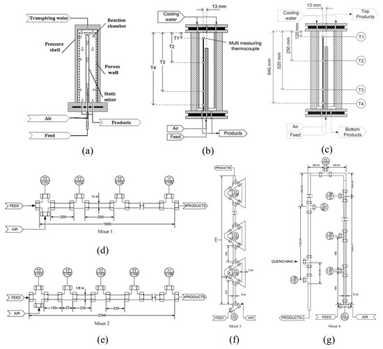 As one of the main institutes, the High Pressure Process Group in the University of Valladolid (UVa), Spanish, has been carrying out investigations from the effects of SCWO on recalcitrant organic matters to the enhancement of degradation efficiency with hydrothermal flame even to the performance of new cooled wall reactor (CWR, which resembles the WCHB of ETH, so the WCHB is used to represent CWR) in energy production. According to the corresponding research content, it has designed various types of reactors, including tubular reactors (Figure 4e–g) [30,32], TWR [33,73,74] and WCHB, with the scale of experimental system expanded from the laboratory level to the pilot level. In terms of the hydrothermal combustor, its new structure upgraded based on the SCWO reactor consisted of the inlet, outlet, and heat-resistant walls (water-cooled wall and transpiring wall) among other parts. In 2006, Bermejo et.al tested the performance and the reliability of three kinds of transpiring walls (Figure 4a) [73]. Wall 1 was completely made by porous materials; Wall 2 was made of nonporous materials for the top and porous materials for the left; Wall 3 was made out of nonporous materials for its upper and lower sections and porous materials for the left. The results showed that Wall 3 was the best. This was because (1) the upper section not only kept the wall from high-temperature damage for a long time, but prolonged the residence time before the mixture with the transpiring flow, and alleviated excessive cooling of the reaction chamber under a high reaction flow rate and a high cooling water rate; (2) the lower section could remain even under subcritical conditions, and the nonporous materials were safe and economical. Therefore, Wall 3 was adopted in subsequent TWRs [33,74]. On the basis of the previous TWR scheme, the innovative WCHB with excellent cooling performance and durability for hydrothermal combustion has been proposed (Figure 4b) [31,75,76]. In addition, its simplicity made it easy to instruct the design of the reactor and the study of hydrothermal flame by comparison between experimental results and numerical simulation results. In order to explore the possibility of using the hydrothermal flame as the way of energy production, the structure and the whole operation system of the reactor were perfected (Figure 4c) [37,77]. The first modification was its inlet and outlet. The reactants flowed into the chamber from the bottom, and the cooling water flowed from the top to the bottom through the annulus between the outer wall and the reaction chamber, dissolving the deposited salt, and thus overcoming the blockage caused by salt-deposition. Furthermore, the other great change was its upper section. Some of the products could be collected from the upper outlet to avoid mixing with cooling water, which was beneficial for the subsequent product analysis and energy generation.
