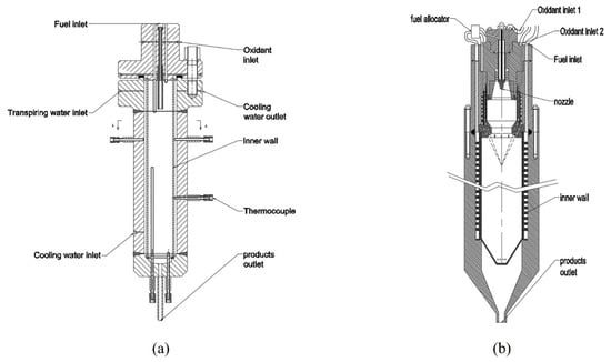 Since 2005, Xi’an Jiaotong University has been committed to the research on the SCHC theories and applications, such as the mechanism and process development of clean conversion and utilization of coal-based fuels [20,21], the mechanism and kinetics of hydrothermal combustion of methanol and other alcohol fuels [39,40,78], the development of high-efficiency HFR [70] and multi-component thermal fluid generator [79]. Its laboratory now has one multi-functional SCHC bench, whose main reactor is shown as below (Figure 5a). With the inlets of fuel and oxidant made of radial concentric tube, the reactor is composed of an outer cylinder bearing wall and an inner cylinder combustion chamber. The annular gap between the both cylinders acts as the cooling water channel. The wall of the inner cylinder can be switched into a water-cooled wall or a transpiring wall depending on different research purposes. When it is used as a water-cooled wall, the cooling water flows through the annular gap from the lower inlet to the upper outlet, and the characteristics of hydrothermal flame and the wall’s cooling performance can be examined. When it is used as a transpiring wall, the cooling water enters the annular gap from the inlet at the top of the bearing wall and seeps into the reaction chamber through the inner porous transpiring wall. Thus, the characteristics of hydrothermal flame and the formation of water film on the inner surface of the transpiring wall can be investigated. However, there are still some problems coming out during the operation: (1) the long delivery line results in a large amount of heat loss, and the temperature would be lower than expected even with certain thermal insulation measures; (2) when the unstable hydrogen peroxide is used as the oxidant, different degrees of decomposition will occur after it was pumped into the reactor, thus affecting the accuracy of the experimental results.