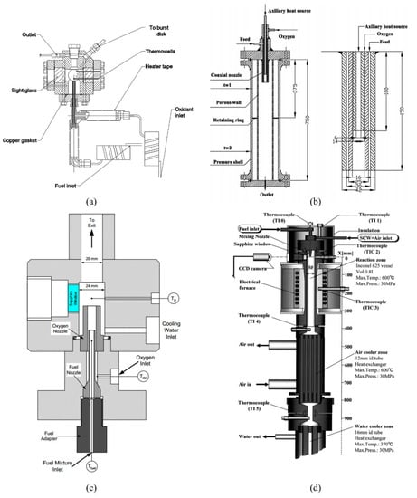 The visual flame cell with a relatively simple structure, designed by Sobhy et al. of McGill University, is mainly composed of ignition nozzle, sapphire window viewport, reaction chamber and external heater (Figure 2c) [50,51]. This bench-scale reactor system with a traditional reaction chamber structure could observe the flame with a charge coupled device (CCD) and a near infrared (NIR) camera and analyze reaction products with two novel gas analyzers. The obtained information about CO and NOx could help explain reaction paths. This paper mainly centered on ignition mechanism, the influence of different fuel concentrations on the characteristics of hydrothermal flame, and reaction products, especially NOx. Therefore, the detailed pros and cons of the reactor structure would not be given here. The semi-batch reactor from NASA John H. Glenn Research Center was to explore the role the SCWO played in destroying the metabolic wastes of human [69] (Figure 2d). Reddy studied the ignition mechanism of n-propanol air hydrothermal flame [60] and the impacts of oxidant characteristics on ignition with this reactor [44]. Its 480 mL chamber capacity, which was dozens of times larger than that for those mentioned before, mitigated the impacts of flow characteristics on the ignition mechanism. Additionally, its whole system that could run in a gravity-free environment could be used to investigate how both buoyancy and mechanical mixing affected flame morphology and reaction rate.