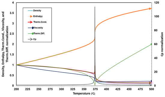 Pseudo critical temperature refers to the temperature under the maximum isobaric special heat capacity of the working medium, and this temperature value increases along with pressure. The point with max specific volume change does not coincide with the point with max constant pressure specific heat change, resulting in a transition region changing from pseudo-liquid to pseudo-vapor state, namely the critical region of supercritical water [107]. In the transcritical process, the physical parameters of water change drastically, which can be considered from two aspects: flow characteristics and heat transfer characteristics (Figure 8). In the flow characteristics, dynamic viscosity characterizes the internal friction coefficient of fluid viscosity. The dynamic viscosity of water decreases sharply near the critical point, approaching gas. The characterization parameters of heat transfer features include thermal conductivity, thermal diffusion coefficient, and constant pressure specific heat capacity. The thermal conductivity peaks around the critical point and grows with the pressure in the proximity of critical pressure. The thermal diffusion coefficient describes the thermal inertia of fluid, indicating the ability to react to the heat distribution change decreases to the bottom. Near the critical point, the response of the fluid to the surrounding heat diffusion becomes retarded, then the temperature gradient begins to develop, providing a strong driving potential for buoyant flow. The promoting effect of critical physical properties on ignition is illustrated by taking hot surface forced ignition as an example. After the subcritical reactants around the hot surface accept heat, the heat spreads rapidly to the surrounding local area due to the high thermal conductivity. However, because of the low thermal diffusion coefficient of the reactants near the critical point and strong thermal inertia, the heats are still mainly concentrated in the local area, resulting in temperature rise. This lays a foundation for subsequent ignition. The experiments by Stathopoulos showed that the rise in mass flow rate barely impact the FIT but only caused the variation of ignition power [55]. These facts revealed that the FIT depended on the change of the physical properties of reactants rather than flow intensity.