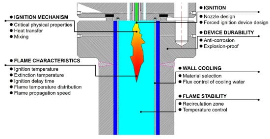 Augustine pointed out that the study of hydrothermal combustion was still in its infancy [14]. Ten years since then, however, the experimental and numerical simulation studies on the characteristics and applications of hydrothermal flame have been further improved. Some studies have even begun to investigate the interpretation of the transcritical ignition mechanism and the magnification criterion for SCHC reactors. As the main experimental apparatus to study the generation and the characteristics of hydrothermal flame, hydrothermal flame reactor (HFR) is designed to confine the flame in a certain space. For example, to explore the hydrothermal spallation drilling of methanol [24,25] and ethanol [26], the ETH water-cooled hydrothermal burner (WCHB) has been upgraded to the fourth generation [23,27], and equipped with advanced measuring [22] and ignition devices [23]. Taking methanol [28,29] and isopropanol [17,30,31,32,33,34,35,36,37] as the auxiliary fuels, the University of Valladolid has optimized their TWRs [33,37] to study the characteristics and effects of hydrothermal flame enhanced SCWO treatment for recalcitrant pollutants. Xi’an Jiaotong University has been gradually expanding its research from coal [20] to high-concentration textile wastewater [38] to methanol [39,40], sludge [38] and quinoline [41] and a series of other fuels in its self-designed reactor [42].