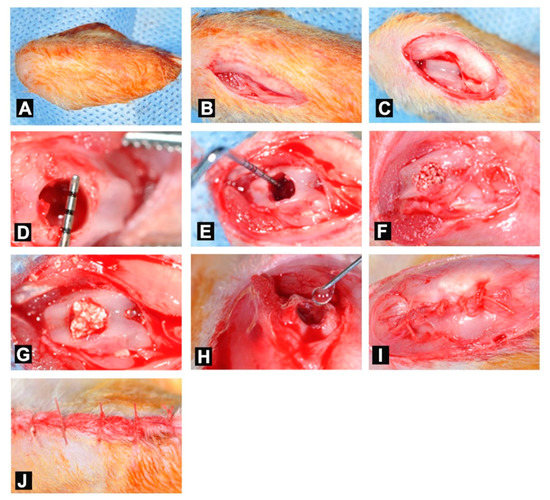 Representative surgical images of bone defect preparation and bone-grafting procedures. (A) Surgical site preparation of the skin over the femoral condyle; (B) parapatellar incision over the knee joint capsule; (C) soft tissue reflection to expose the underlying femoral condyle; (D,E) experimental bone defect measuring 3 mm in diameter and 3 mm in depth; (F–H) bone defects filled according to the experimental grouping protocol; (I) closure of subcutaneous tissues; and (J) skin closure.