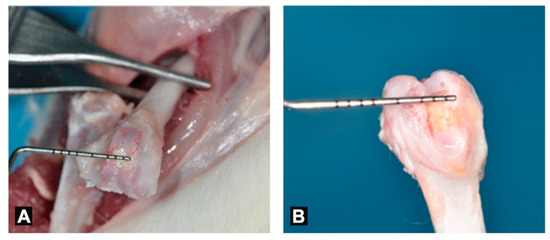 Representative images showing retrieval of the femoral condylar samples without any associated overlying soft tissue. (A) Sectioning the condylar bone from the remaining femur; (B) experimental bone defect with any remaining biomaterials if grafted.