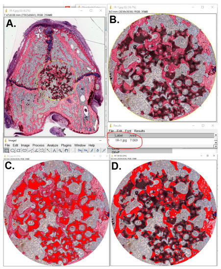 Representative histological sections showing histomorphometrical measurements using imageJ software. (A,B) A region of interest (ROI) measuring 3 mm in diameter and corresponding to the defect cross-section; (C) for selecting and measuring the percentage (%) of remaining biomaterials; (D) for identifying bone area in (%).