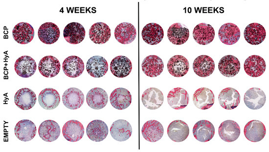 In Table 1 and Figure 5, histomorphometrical evaluation revealed an overall increase in the NF-BA (%) from four weeks to 10 weeks in all the groups. At four weeks, the highest NF-BA (%) was observed in the BCP group followed by the BCP + HyA, HyA, and control groups. Statistically significant differences in the NF-BA (%) were observed between the BCP grafted groups and the non-grafted groups (p < 0.05). Similarly, at 10 weeks, the NF-BA (%) in the BCP and BCP + HyA groups was significantly higher than that of the HyA and control groups (p < 0.05). Interestingly, the addition of HyA to BCP did not significantly increase new bone formation as evidenced by the histomorphometrical findings. Along with an increase in NF-BA (%), there was a concomitant decrease in the R-BCP (%) in both the BCP and BCP + HyA groups.