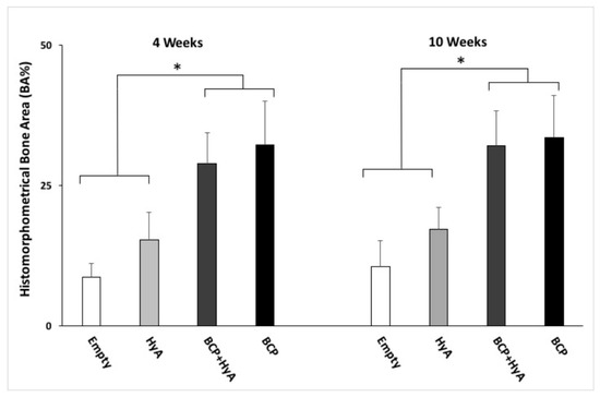 Bar-chart with mean and standard deviation based on histomorphometrical assessment showing bone area (BA%) for all study groups at 4 weeks and 10 weeks. (* indicates p < 0.05)